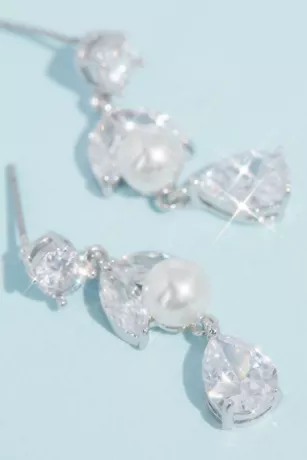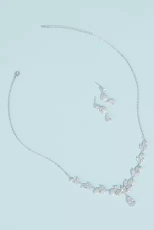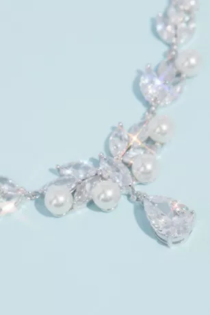 A single tear teardrop-cut crystal dangles from a cubic zirconia-and-pearl vine on this pretty necklace and earring set.