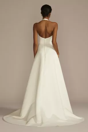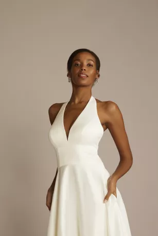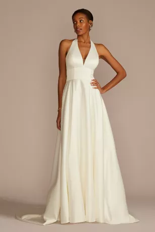 Simple yet stunning, this satin low-back wedding dress features a plunging halter neckline, flattering wide waistband, and flowy A-line skirt. A chapel train completes the look with subtle drama.
