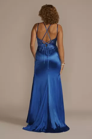 You’re guaranteed to look radiant at prom or your next special event in this satin sheath dress featuring an illusion plunge neckline and fitted bodice adorned with patterned heat set embellishments. A sexy skirt slit completes the look.