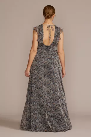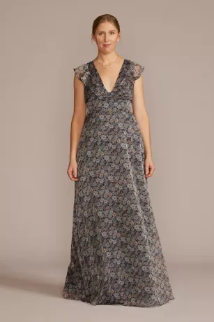 A daring deep V-neckline is met with a youthful touch on this floor length chiffon gown. Ruffles leave their mark on short sleeves and cascade down the skirt.