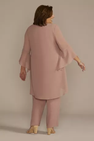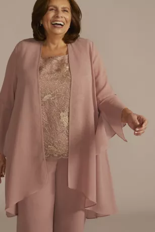 Breezy and beautiful, you’ll be ready for any special occasion in this three-piece, plus size set, with a waterfall jacket and wide-leg pant made from comfortable, flowy georgette. A metallic lace shell, complete with a scalloped hem, finishes the look.