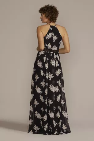 A floral print and halter neck have never looked better together than on this effortless chiffon maxi. Practically begging to be worn to a spring wedding or outdoor event, the illusion details through the bodice and waistline make it the perfect combination of sweet and sexy.