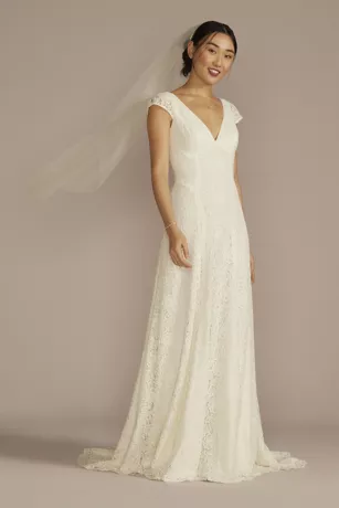 This lace wedding dress is thoughtfully designed with recycled fabrics. The dainty floral pattern has a breezy feel that’s perfect for beach weddings. Sheer cap sleeves and a deep V-neckline complete the look.