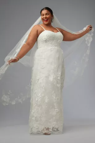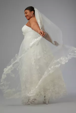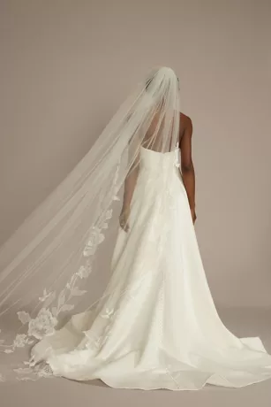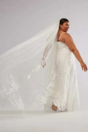 This tulle chapel veil channels bridal romance with a sustainable twist featuring recycled floral lace overlays that frame your figure.