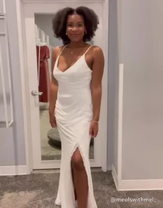 Sleek, simple, and sexy, this slinky stretch jersey sheath dress accentuates curves with figure-flattering draping at the hip and ruching along the rear. The delicate spaghetti straps, V-neckline, and lace-trimmed slit add a dash of romance to the look.