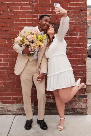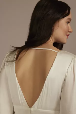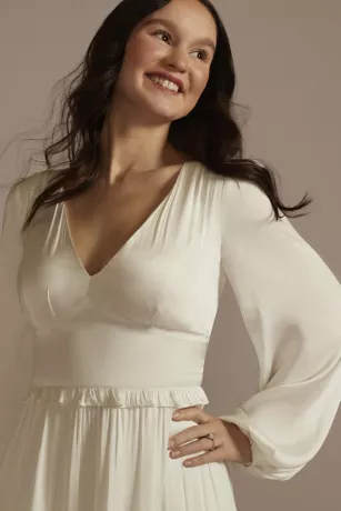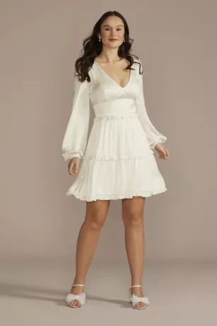 Ideal for casual ceremonies, bridal showers, or bachelorette parties, this little white dress is a must-have for any bride. Long cinched sleeves balance out the mini length, while a V-neck, empire waist, and ruffles add shape-defining details.