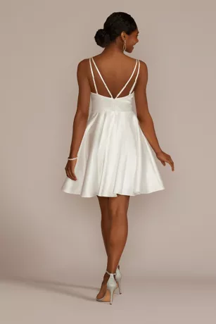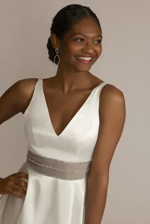 Show off your glam side in this satin A-line dress featuring rows of crystals atop an illusion waist detail. The best part? She has pockets!