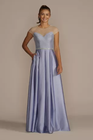 On this prom-perfect satin ball gown, sparkling embellishments sit atop a sheer cap sleeve top, revealing a gorgeous sweetheart neckline. Trim at the waist highlights the beautiful shape, while pockets ensure no necessity is forgotten.