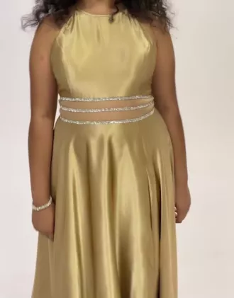 Rows of crystals atop an illusion inset give this high-neck satin A-line dress a glam two-piece look. Just right for prom or any college formal.
