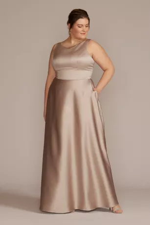 Classically beautiful, this satin bridesmaid dress features a chic boatneck and full A-line skirt with pockets.