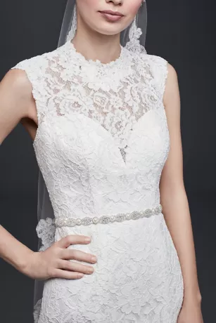 Statement pearls and micro crystals combine on this sash’s scallop motif. The sheer organza ribbon will blend right in with your dress.