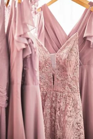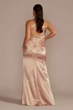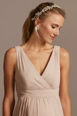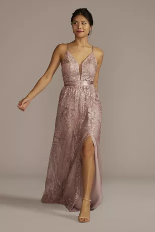 Gorgeous sequin embroidered fabric makes this plunge neckline bridesmaid dress a sexy standout.