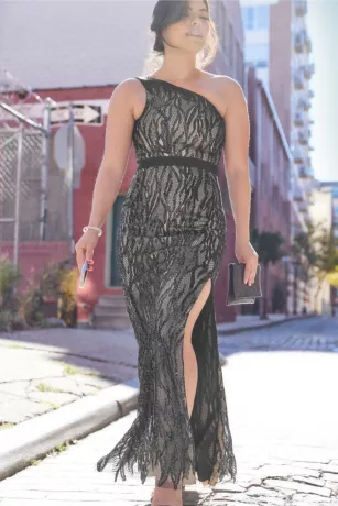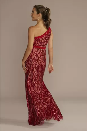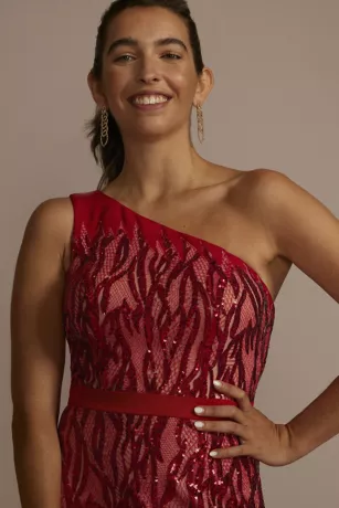 Glistening lines elongate the silhouette of this sequin gown, from the one-shoulder neckline to the slit-accented skirt.