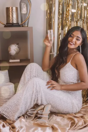 Perfect for a second outfit or a modern wedding, this hand-beaded linear jumpsuit elongates the legs with a slightly-flared pant, while the embellished overlay lends extra movement to the silhouette. Finished with delicate spaghetti straps that frame the faux-wrap blouson bodice.