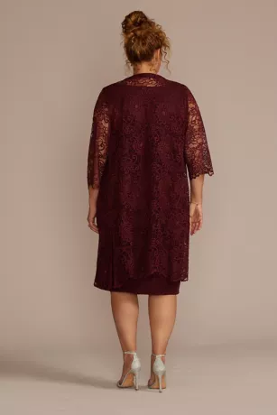 This knee-length plus-size sheath dress is detailed with a beaded V-neckline and comes with a matching jacket featuring sheer three-quarter sleeves.