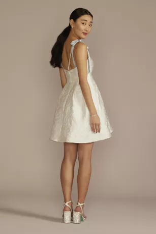 Get party-ready in a sassy sweetheart jacquard dress. The short A-line hem showcases your heels while skirt pockets allow for easy stashing of your must-haves. Customize your look with interchangeable white or blue shoulder-tie straps, or wow in a strapless number.
