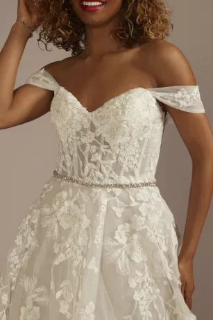 Secured by sheer organza ribbons, this skinny sash is topped with clusters of sparkling beads, gems, and rhinestones that tie up your dream day in the perfect bow.