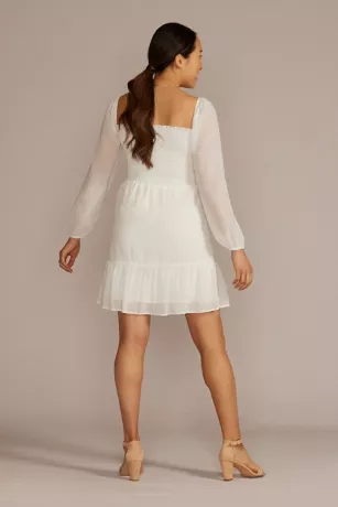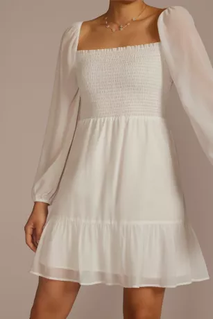 Embrace modern Regency-era vibes for your bachelorette bash or bridal shower in a square neck short dress. Smocked fabric at the bust provides a comfortable stretch and long billowing sleeves keep you warm through chilly nights. A tiered skirt offers a fun flair and beautiful movement as you dance, walk, and twirl.