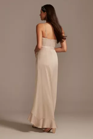 Crafted of crepe-back satin, this bridesmaid dress has a luminous shine from the spaghetti-strap neckline to the ruffled skirt hem. A tie at the waist adds the finishing touch.