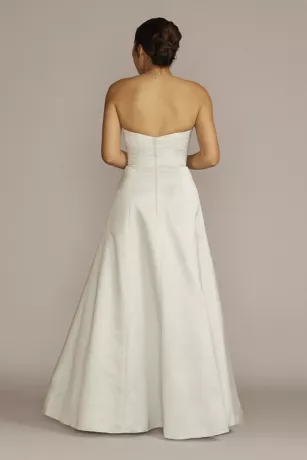Keep your wedding look simple and stunning in a floor-length satin gown. The strapless bodice and A-line silhouette are universally flattering and scream bridal beauty.