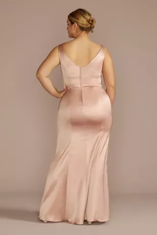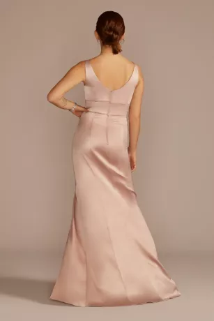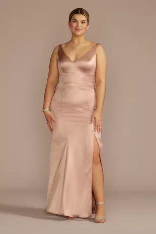 This glamorous stretch satin sheath is an elegant choice for your bridesmaids. Features a classic V-neckline and tank straps.