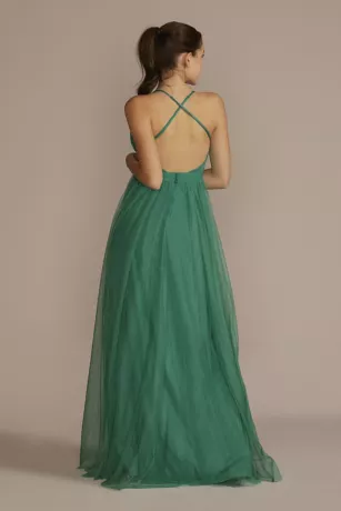 Classic, with a sexy twist. This tulle prom dress features a plunging V-neckline and open back with crisscross spaghetti straps.