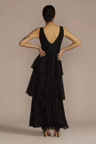When wearing this flouncy tiered dress, every step you take is like strutting down the runway. Lovely lace fabric adds dimension to an already memorable party-ready look.